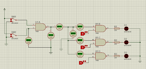 Jawab : yaitu ketika switch yang terhubung dengan gerbang logika NAND U1:A salah satu atau keduanya terhubung dengan ground, dimana artinya salah satu atau kedua inputnya akan berlogika 0. JIka salah satu atau kedua input dari gerbang logika berlogika 0 , outputnya akan berlogika 1 (high). Sehingga arus outputnya akan high (IOH). Dan arus input pada input U1:B, U1:C, U1:D juga akan high (IIH)